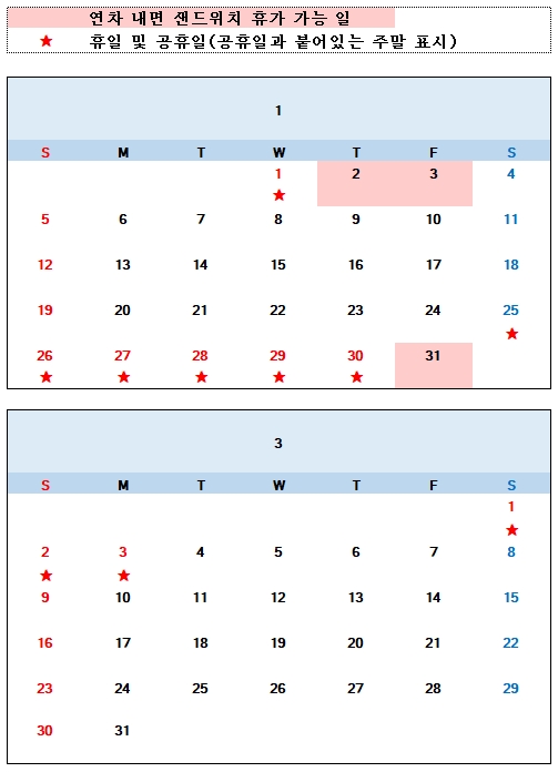 | 3/1(토) ~ 3/3(월) | 연차 없이 가능 | 3일 연휴 | 삼일절(토) → 3/3 대체공휴일 |